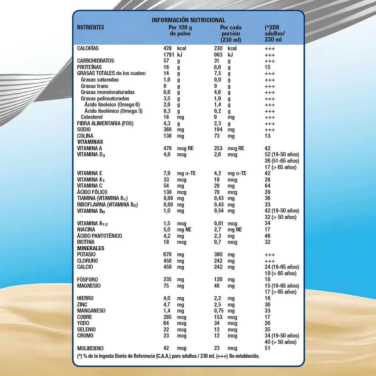 Su fórmula completa y balanceada aporta proteínas, fibra, carbohidratos, ácidos grasos y 28 vitaminas y minerales esenciales, ideales para cubrir las necesidades nutricionales del organismo.